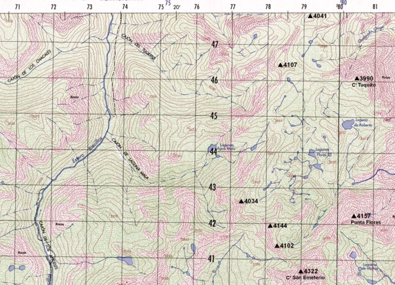 En una planicie unos 100 metros más al este encontramos un círculo de piedras que marcaban un buen lugar de aterrizaje de helicóptero. Tal vez no éramos los primeros humanos, pero probablemente sí los primeros que lo subimos caminando desde Riecillos (desde 1300 m s.n.m). En fin, la P4144 ya tenía nombre, era el cerro Diamante, nombre que a veces se le daba a su vecino, el san Emeterio, con lo cual resolvimos esta confusión.